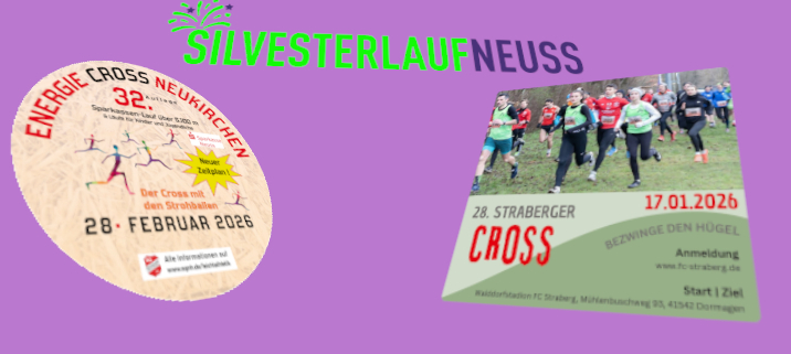 Am 31. Dezember geht es nach Uedesheim zum 10 km Silvesterlauf. Euch erwartet eine Strecke mit toller Aussicht! Und dann geht es mit dem 28. Straberger Crosslauf im wunderschönen Walddorf Straberg weiter. Eine anspruchsvolle „Berg- und Talfahrt“, versprochen! Und danach, wenn einmal die Spikes schmutzig sind, geht es zu dem Cross mit den Strohballen nach Neukirchen-Hülchrath. Der 32. Energie Cross steht an. Ein Muss für jeden Geländefreund! Alle Informationen zu den Läufen findet ihr unter „Veranstaltungen“. Euch viel Spaß und man sieht sich auf oder an den Strecken.